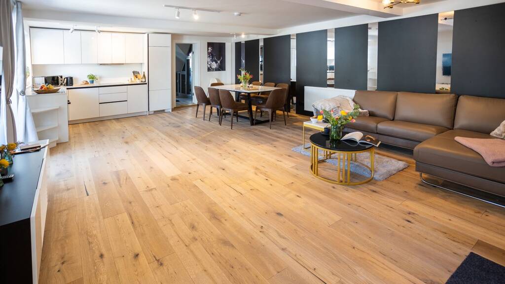 Der offene Wohn- und Essbereich mit einer hochwertigen Küchenzeile, einem gemütlichen Essplatz, einer einladenden Sofalandschaft und einem Flatscreen-TV bildet das Herzstück der Wohnung. Hier lässt sich entspannt der Alltag genießen.