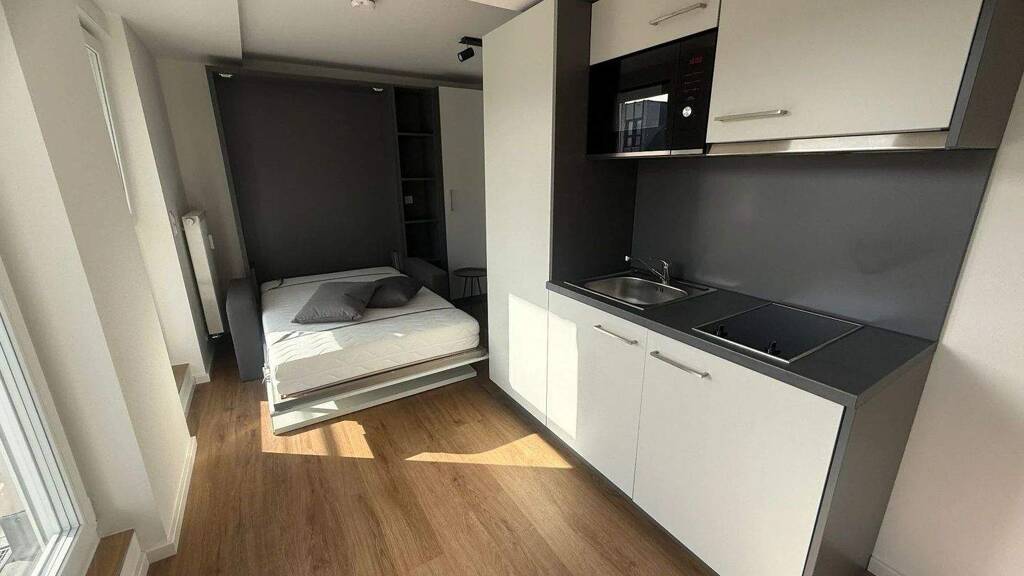 . Möbliertes 1-Zimmer-Apartment (Küche, Bett, Arbeitsbereich) . Balkon . Platzsparendes Wandklappbett . Aufzug (5. Obergeschoss) . Moderne Einbauküche mit Herd, Kühlschrank und Mikrowelle . Schönes Badezimmer mit Glasdusche . Waschraum im Keller . Anschluss für kleine Toplader-Waschmaschine in der Wohnung möglich . Fahrradkeller . Eigenes Kellerabteil . Energieeffizienzklasse A (39,5 kWh/m²)