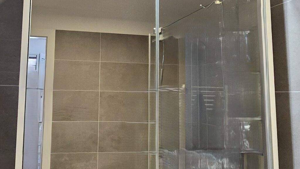 * Badezimmer mit Feinsteinzugverfliesung, Dusche, Waschbecken und WM-Anschluß