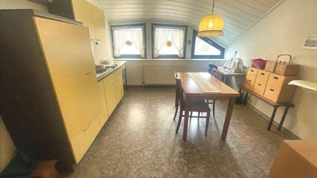 Im Dachgeschoss erwarten Sie zwei kleinere Zimmer, zwei sehr große Zimmer, eine Küche und ein Badezimmer mit Dusche.
