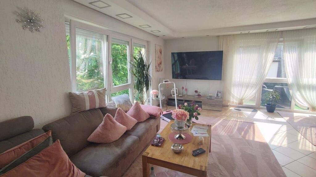 Die Fenster sind zweifach verglast und in Kunststoffrahmen gefasst. Sie sind größtenteils raumhoch gestaltet und sorgen für helle Räume.