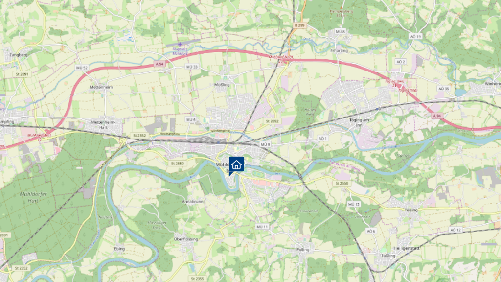 Die Autobahnauffahrt Mühldorf-Nord A 94 ist in ca. 5 Minuten mit dem Auto erreichbar. Die Landeshauptstadt München erreichen Sie von hier in ca. 35 Minuten.