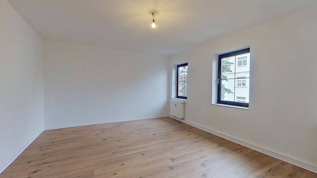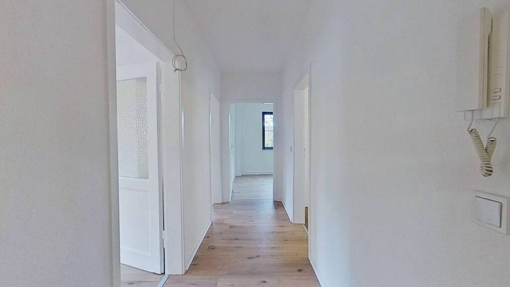 Alle Räumen werden von einem geräumigen Flur aus erreicht. Herzstück der Wohnung ist das Wohn- und Esszimmer. Drei große Fenster mit schmucken dunklen Holzrahmen bringen viel Tageslicht in den Raum hinein und geben Ihrem neuen Lebensmittelpunkt Charakter.