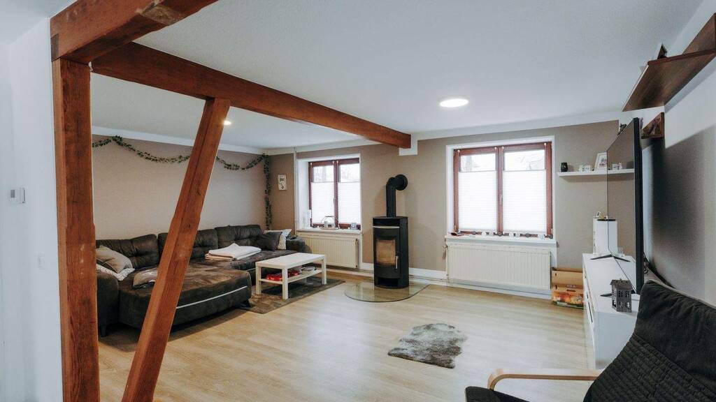 Von hier aus fällt der Blick geradeaus in das großzügige Wohn- und Esszimmer - das Herzstück des Hauses. Dieser beeindruckend große Raum erstreckt sich über die gesamte Tiefe des Erdgeschosses und bietet zur Vorderseite hin einen freien Blick zur Straße. Ein Kaminofen setzt einen behaglichen Akzent und schafft eine warme, wohnliche Atmosphäre. Der Essbereich fügt sich harmonisch in den Raum ein und öffnet sich mit direktem Zugang zur Terrasse, wodurch Innen- und Außenbereich auf angenehme Weise miteinander verbunden werden.
