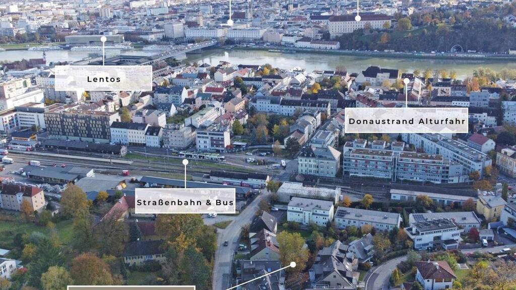 Besonders hervorzuheben sind die vielfältigen Möglichkeiten direkt vor der Haustüre: Die Haltestellen von Straßenbahn, Bus und Mühlkreisbahn befinden sich am Ende der Straße. Im 500 m Umkreis liegt der Urfahraner Grünmarkt mit seinen Gastro- und Einkaufsmöglichkeiten sowie das beliebte Freizeitparadies Donaustrand Alturfahr. In neun Minuten zu Fuß erreichen Sie das Einkaufszentrum "Lentia City" und kurz darauf den Linzer Hauptplatz mit anschließender Einkaufsmeile "Landstraße".