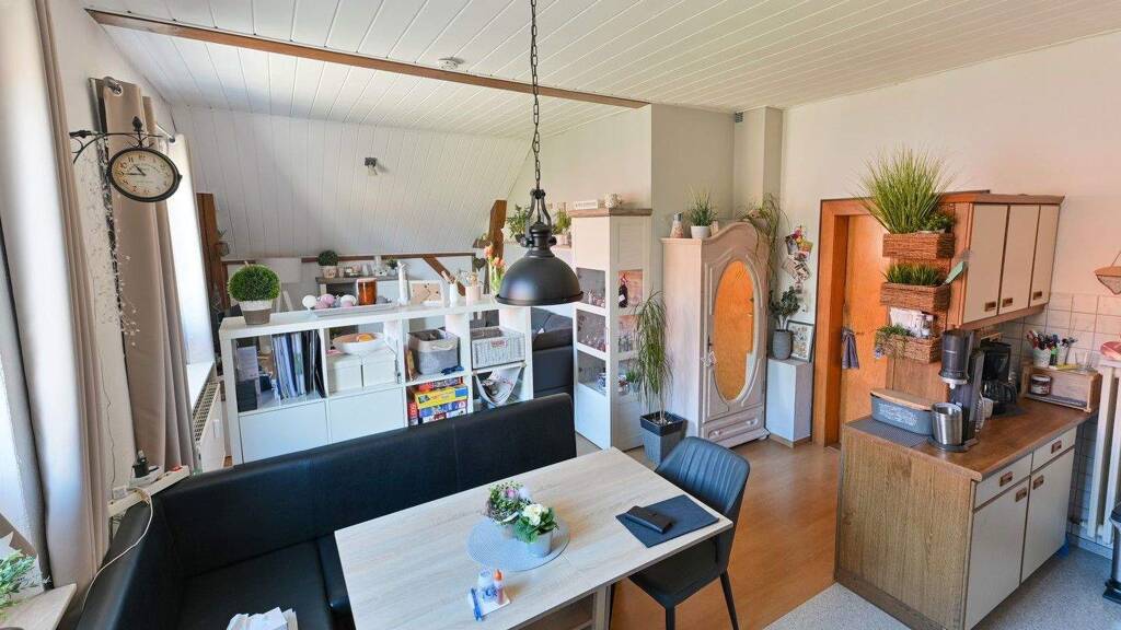 - großes Wohnzimmer mit Essbereich und offener Küche, (ohne die alte Einbauküche, in Abstimmung kann auf Wunsch eine neue, weiße Küchenzeile inkl. Herd und Backofen gestellt werden. Keine Einbaugeräte)