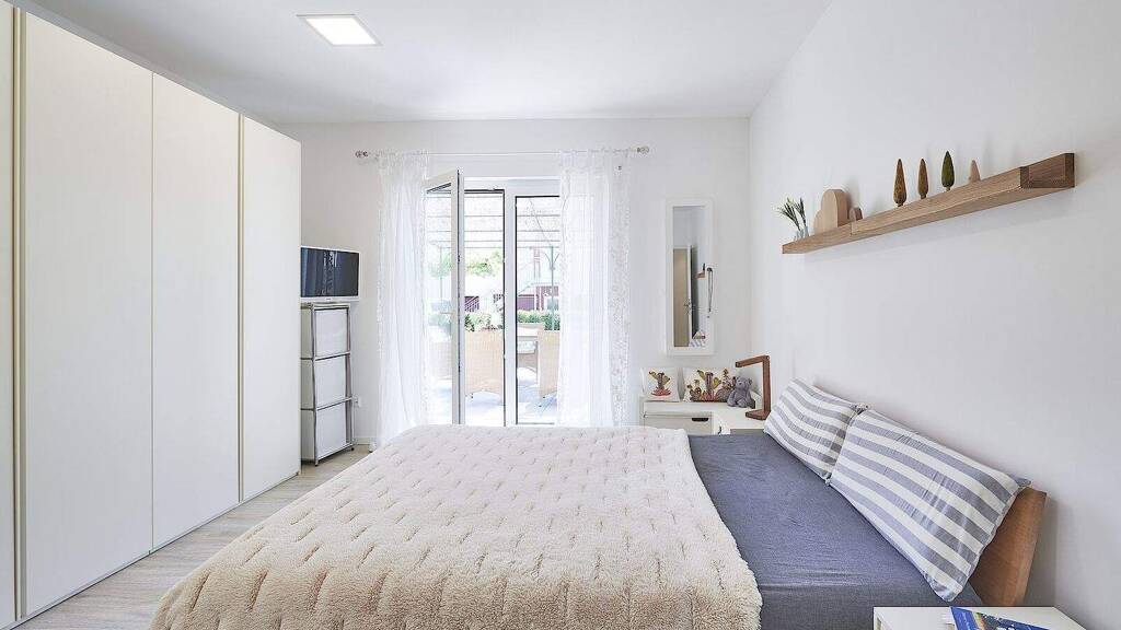 1 Diele mit offenem Zugang zum Wohn-Esszimmer-Küchen-Bereich, 1 Bad, 1 Gästezimmer, 1 Kinderzimmer und 1 Schlafzimmer.