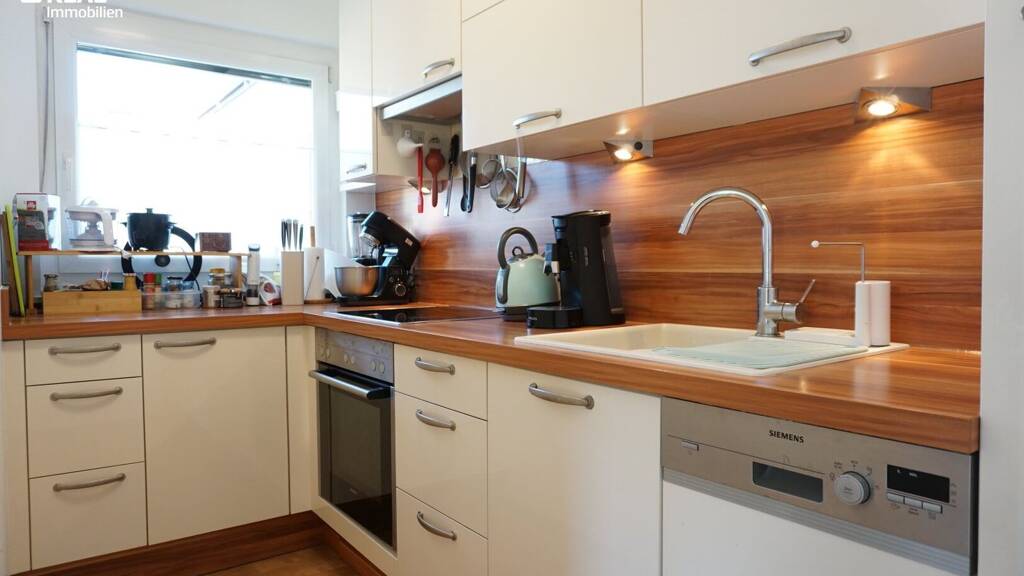 Der Wohnbereich ist lichtdurchflutet und mit Parkett ausgestattet, was für eine warme und einladende Atmosphäre sorgt. Die moderne Einbauküche macht Kochen zu einem wahren Vergnügen und der herrliche Ausblick vom nach Westen ausgerichteten Balkon trägt ebenfalls zum Wohlbefinden bei.