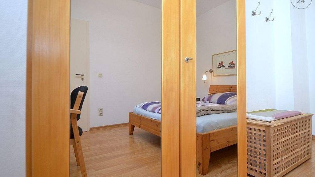 Im Schlafzimmer befindet sich ein französisches Bett (1,60x2,00 m), 2 Nachttische, Schreibtisch mit Stuhl und ein 2-türiger Spiegelkleiderschrank.