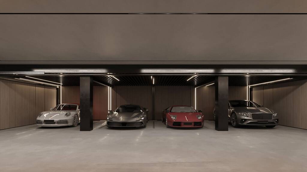 Der großzügige Eingangsbereich erstreckt sich über drei durchdacht gestaltete Etagen und bietet durch große Fenster und hohe Decken einen beeindruckenden Ausblick. Das Erdgeschoss verfügt über elegante Wohn- und Essbereiche, ein gemütliches Fernsehzimmer und eine beeindruckende Designerküche mit einer individuell gestalteten Kochinsel.