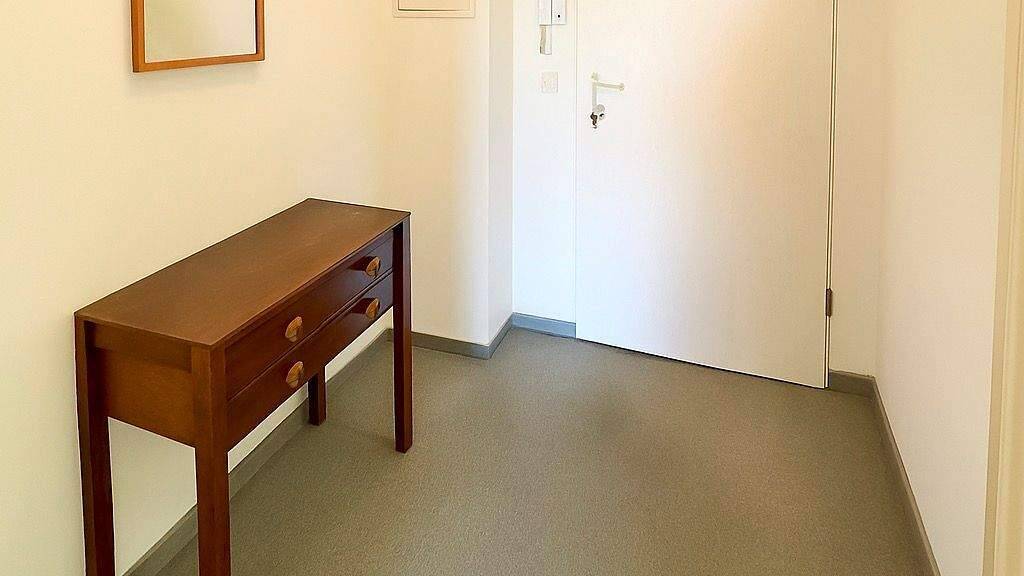 Der Wohn-/Schlafraum lässt sich sowohl funktional als auch gemütlich einrichten - mit Platz für Sofa, Bett, Esstisch und Stauraum. Die integrierte Küchenzeile ist dezent entlang der Wand platziert, sodass der Raum optimal genutzt werden kann.