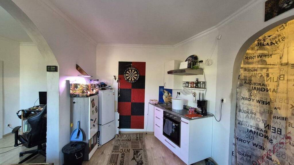 - sonnig helle KĂĽche mit groĂźem TĂĽrbogen, welcher als romantischer Eingang ins Wohnzimmer dient