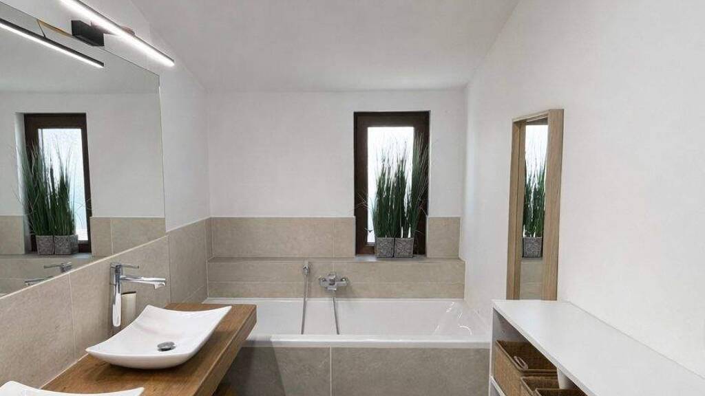Die Wohnung verfügt über eine komfortable und moderne Sanitärlösung. Das Hauptbadezimmer ist mit Doppelwaschbecken, Badewanne und Dusche ausgestattet, während ein weiteres Bad en suite mit Dusche zusätzlichen Komfort bietet. Ein separates WC ergänzt die praktische Raumaufteilung.