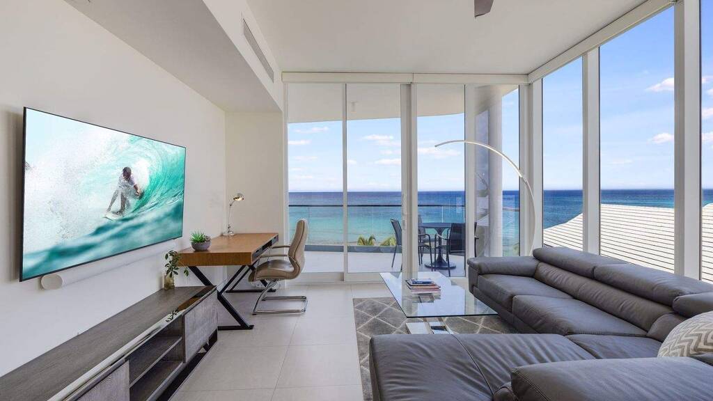 Ein wunderschöner, breiter Balkon am Strand ist ideal für Sonnenuntergänge, Entspannen, Essen und Unterhaltung. Wenn Sie wirklich den besten Strandlebensstil suchen, bietet dieses Haus beispielloses, maßgeschneidertes Wohnen am Seven Mile Beach. Es ist komplett schlüsselfertig - komplett eingerichtet mit brandneuer Einrichtung, Bettwäsche, Bettwäsche, einem umfassenden Küchenpaket mit allem, was Sie jemals brauchen würden, einschließlich Arbeitsplattengeräten, sowie einem erweiterten Audio-Visual-Paket mit Samsung Art Frame Fernsehern im Wohnzimmer und in jedem Schlafzimmer.