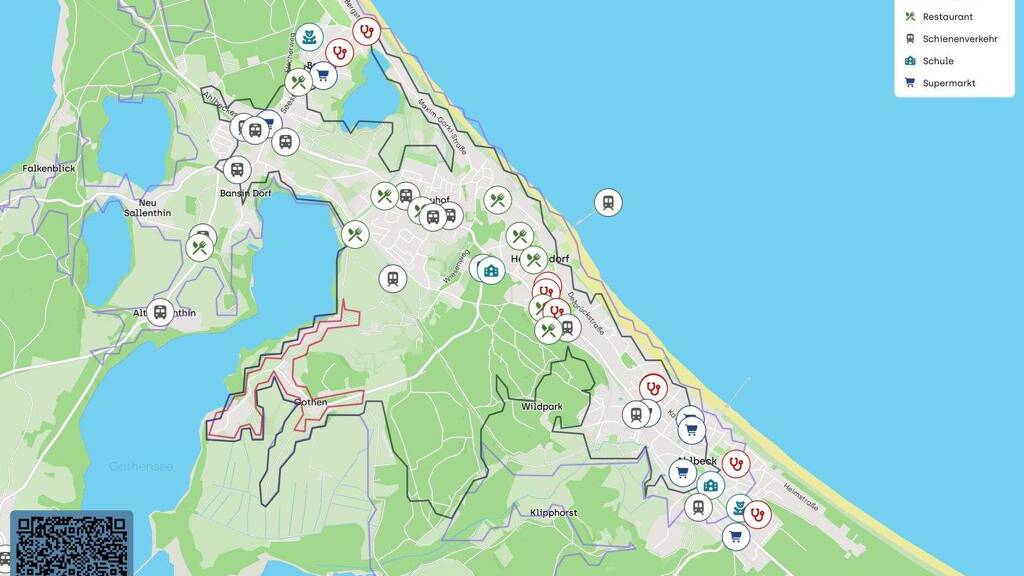 Der nächste Bahnhof ist in ca. 1,7 km Entfernung, was eine bequeme Anbindung an den öffentlichen Nahverkehr ermöglicht. Für den täglichen Bedarf sind ein Lidl, Aldi, Edeka und ein Rewe in etwa 3 km erreichbar. Die medizinische Versorgung ist durch die nahegelegene Inselklinik Heringsdorf in ca. 2 km Entfernung gesichert.