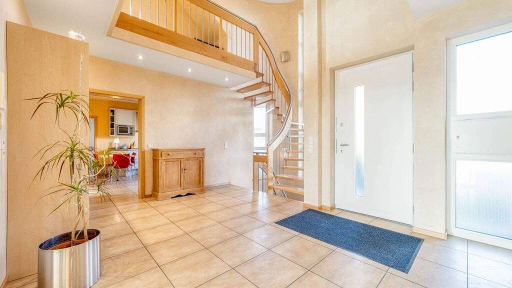 Schon der erste Eindruck unterstreicht diesen Anspruch. Der repräsentative Eingangsbereich öffnet sich über zwei Geschosse und wird von einer elegant geschwungenen Wendeltreppe geprägt. Raumhohe Fensterfronten lassen viel Licht ins Haus und verbinden Erdgeschoss und Galerieebene zu einem offenen, großzügigen Raumgefüge. Alles wirkt bewusst proportioniert, ruhig und wertig - ein Haus, das Haltung zeigt, ohne laut zu sein.