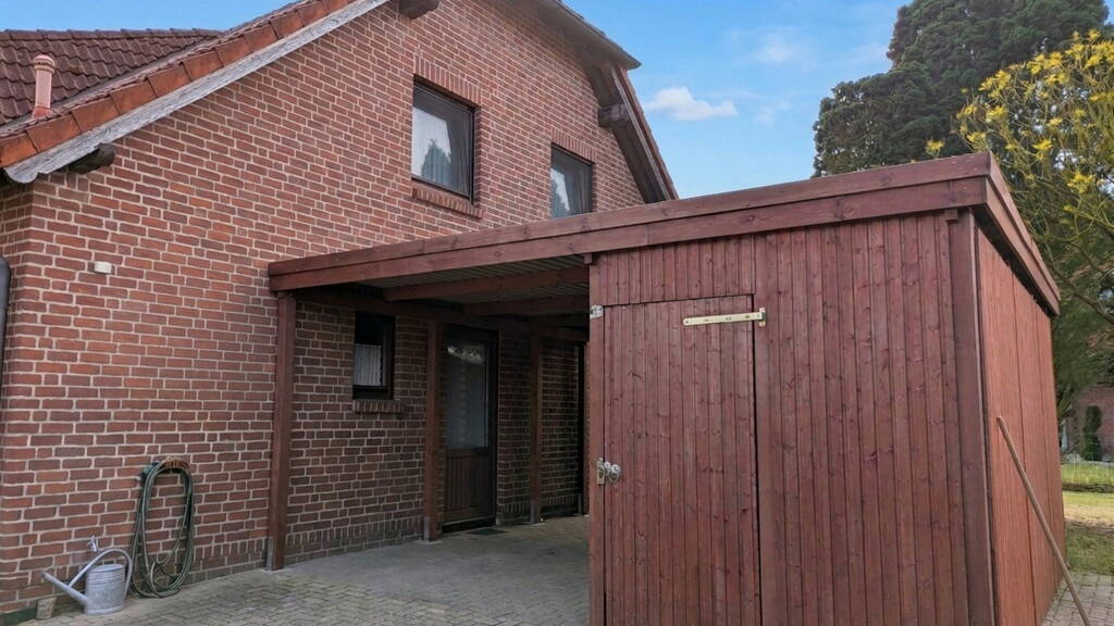 Im Außenbereich befinden sich neben einer blickgeschützten Terrasse ein Carport, ein sehr großer Schuppen und eine Werkstatt. Auch ein zusätzlicher Stellplatz ist vorhanden.