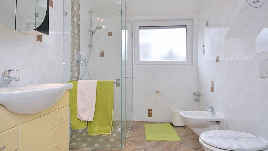Das Badezimmer mit Tageslicht verfügt über eine ebenerdige Dusche und einem Bidet.