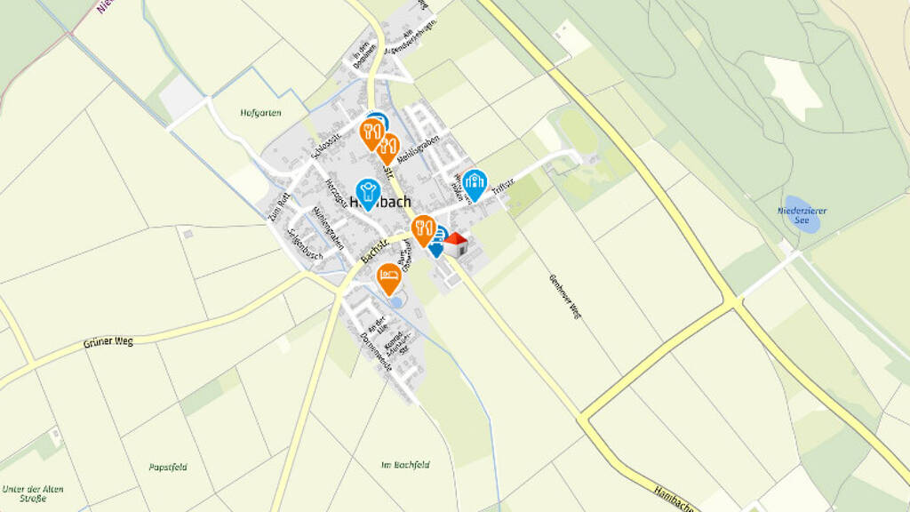 Niederzier-Hambach: Hambach ist ein Ortsteil von Niederzier dem Hauptort der Gemeinde. Hambach hat ca. 1350 Einwohner und ist dörflich strukturiert, was aber nicht heißt das die Infrastruktur schlecht wäre. Ganz im Gegenteil. So verfügt Hambach über zwei Kindergärten. Die Grundschule ist ebenfalls vor Ort. Die nächste weiterführende Schule ist in Niederzier. Im Hauptort Niederzier ist die vollständige Nahversorgung gegeben. In gerade mal 4 bis 6 Fahrminuten, gibt es Bäcker, Eisdiele, Restaurants, Schnellimbiss, Post, Banken, Discounter, Supermarkt, Gemeindeverwaltung, Ärzte, ... Hambach selbst hat aber auch einiges zu bieten: 2 Hotelbetriebe, 1 Gaststättenbetrieb, Paketshop, Friseur, Fachgeschäfte. Besonders sind auch das alte Schloss Hambach und Burg "Obbendorf" im Ort. Prägend ist auch die schöne Pfarrkirche St. Antonius und der Ellbach, welche durch den Ort fliest. Das Freizeitangebot ist hoch, es gibt zahlreiche Vereine im Dorf, Tennisplätze, einen Fußballplatz und vor der Haustüre liegt die Sophienhöhe, ein Naherholungsgebiet zum Radfahren, wandern, entdecken.