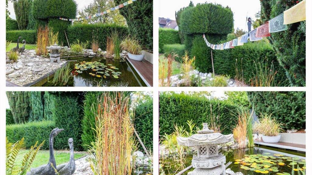Besonderes Highlight ist die großzügige Gartenanlage mit asiatischen Bäumen und Sträuchern sowie einem Fischteich nebst Ruheplätzen zum Träumen. Das besondere Grundstück mit 1001 m² eignet sich besonders gut für gesellige Abende und entspannte Stunden im Freien.