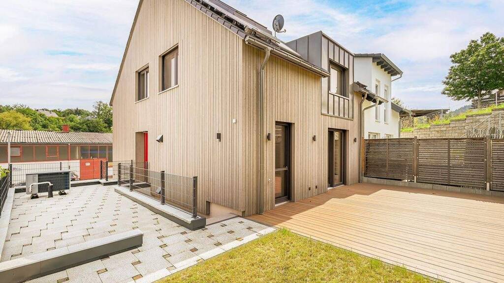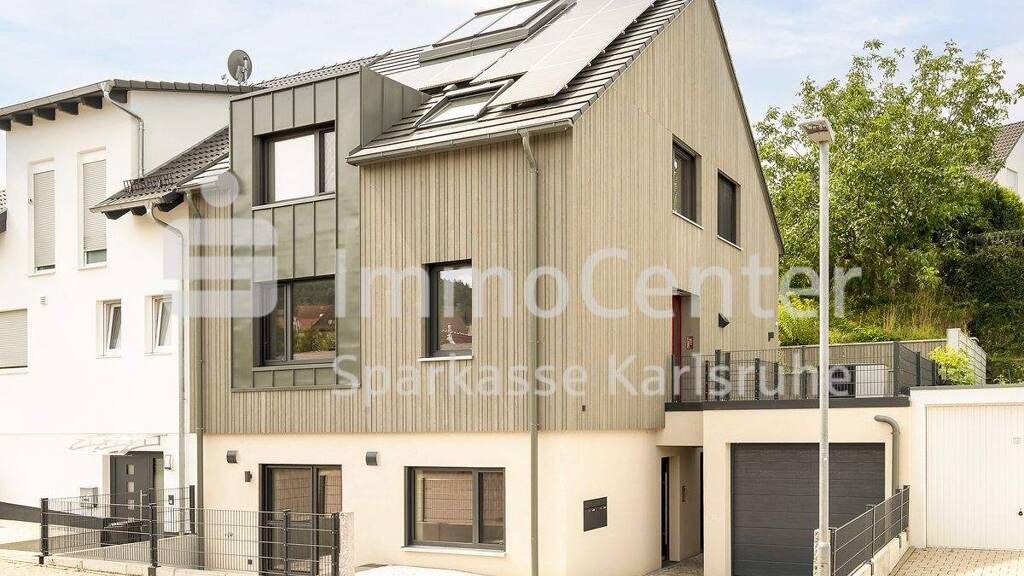 In ruhiger Hanglage von Waldprechtsweier bietet diese hochwertig errichtete Doppelhaushälfte mit Einliegerwohnung auf ca. 222?m² Wohnfläche ein durchdachtes Wohnkonzept mit nachhaltiger Bauweise und zukunftsweisender Technik. Auf einem ca. 283?m² großen Grundstück verteilt sich die Wohnfläche auf acht Zimmer, darunter fünf Schlafzimmer und drei Bäder. Zwei Terrassen - jeweils eine für die Einliegerwohnung und eine zur oberen Wohneinheit - sind ebenfalls vorhanden. Die Immobilie wurde massiv gebaut. Das untere Geschoss mit Einliegerwohnung, Technikraum und großer Garage entstand als WU-Beton-Fertigteilkeller von Glatthaar (WDVS mit EPS ausgeführt). Die darüber liegenden Geschosse wurden aus Kalksandstein errichtet. Für die Fassadendämmung kam eine ökologische Holz-Weichfaserdämmung zum Einsatz (Haus oben und Dach). Die vorvergraute, hinterlüftete Holzverschalung unterstreicht den modernen Charakter. Im Innenraum schafft hochwertiger Kalkputz ein angenehmes Wohnklima. Das Satteldach ist mit schwarzen Tonziegeln gedeckt und verfügt über eine elektrisch öffenbare Firstverglasung von Velux mit Sonnenschutzrollos. Die dreifach verglasten Fenster von Gaulhofer (RC2-Fenster, Widerstandsklasse 2) sind mit integrierten Insektenschutzgittern sowie elektrischen Außenjalousien ausgestattet. Die Innenausstattung überzeugt mit Eichenparkett in Wohn- und Schlafräumen sowie großformatigem Feinsteinzeug in Bädern, Küchen und Dielen. Eine offen gestaltete Treppe aus massiver Esche verbindet die Etagen elegant. Die Bäder sind mit hochwertigen Produkten von Geberit, Hansgrohe und Villeroy & Boch ausgestattet und verfügen über bodengleiche Duschen, ein Vollbad im Obergeschoss sowie separate Anschlüsse für Waschmaschine und Trockner. Die Einliegerwohnung ist barrierearm begehbar und bietet vielseitige Nutzungsmöglichkeiten - als Gäste-, Büro- oder Generationenbereich. Die Hauptwohnung bietet ein Duschbad im Erdgeschoss und ein großzügiges Vollbad im Obergeschoss. Eine Luft-Wärmepumpe von Viessmann sorgt für effiziente Beheizung. Die Hauptwohnung verfügt über eine zentrale Lüftungsanlage mit Wärmerückgewinnung, die Einliegerwohnung über dezentrale Lüfter. Eine 7,7?kWp-Photovoltaikanlage mit 8?kWh Stromspeicher von Viessmann erfüllt den Energiestandard KfW 40 Plus. Ein elektrisches Hörmann-Garagentor sowie eine Wallbox für E-Mobilität runden die Ausstattung ab. Diese außergewöhnliche Immobilie verbindet energieeffiziente Bauweise, hochwertige Materialien und moderne Architektur in naturnaher Lage - ideal für Familien, Mehrgenerationenhaushalte oder alle, die komfortables Wohnen mit nachhaltigem Anspruch verbinden möchten.