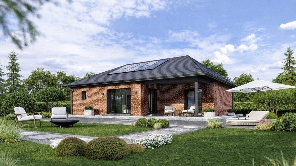 Auf einem ca. 860 m² großen Baugrundstück entsteht ein moderner Bungalow mit überdachter Terrasse. Das Haus bietet ca. 133 m² Wohnfläche und eignet sich ideal für barrierearmes Wohnen auf einer Ebene.