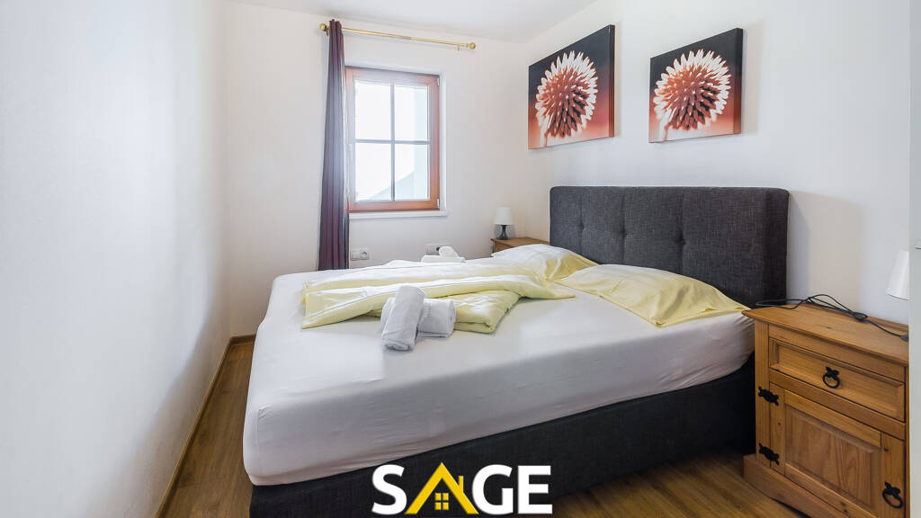 Aufgeteilt ist die Wohnung in eine offene Küche im Wohn- und Essbereich mit Ausgang auf die nach Südosten gerichtete Terrasse, 2 Schlafzimmer, ein Badezimmer mit Badewanne und Doppelwaschbecken, ein WC separat und einen Abstellraum. Das gesamte Appartement ist mit einem hochwertigen Vinylboden ausgestattet.