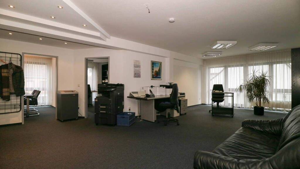 Diese Gewerbeeinheit ist im 1. Obergeschoss. Die 130 m² Bürofläche teilen sich wie folgt auf. Zuerst begrüßt Sie ein großer Dielenbereich, der Zugang zu allen Räumen und zum Balkon schafft. Auf der linken Seite befindet sich ein Konferenzraum. Daneben befindet sich der größte Raum. Auf der ge...