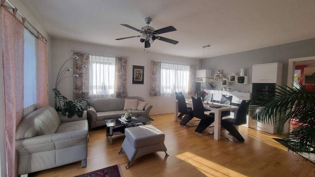 Dieser 2008 errichtete Bungalow (Malli-Haus, Ziegelmassivbauweise) mit knapp 160 m2 Wohnfläche und 598 m2 Grund beeindruckt durch ein pärchengerechtes Erdgeschoss und eine 2-Zimmer-Gästewohnung mit eigenem Duschbad im Obergeschoss.