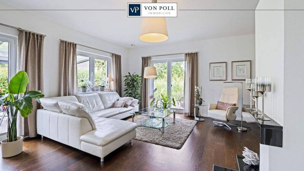 Schon der Eingangsbereich mit geräumiger Diele zeigt die insgesamt helle und luftige Architektur des ca. 132m² großen Hauses. Der großzügige Wohn- und Essbereich mit stilvollem Kamin lädt zum gemütlichen Beisammensein ein. Die halboffene Küche mit moderner Einbauküche lässt kaum Wünsche offen. Durch Schiebetüren lassen sich Wohnzimmer und Küche auf Wunsch bequem trennen.