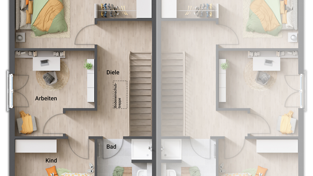 Das TC Doppelhaus Aura 125 überzeugt nicht nur mit seinen hellen und gemütlichen Räumen, sondern auch mit einer cleveren Grundrissgestaltung. Der vorhandene Platz wird optimal genutzt. Im Eingangsbereich kann ein praktischer Einbauschrank untergebracht werden und die Ankleide im Schlafzimmer bietet viel Stauraum. Auch der Platz unter der einläufige Treppe kann genutzt werden, zum Beispiel für ein Bücherregal oder eine kuschelige Spielecke für die Kleinen.