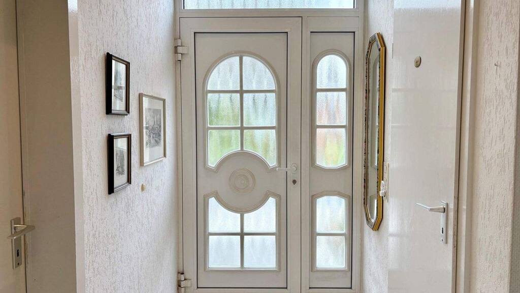 Zur Haustür hinein befinden Sie sich im hellen Eingangsbereich, der direkt zur linken Seite das Gäste WC im Retro-Look bereit hält. Daneben verbirgt sich eine praktische Garderobennische mit Spiegelwand. Von der Diele zu Ihrer Rechten gelangen Sie in die geräumige Küche mit jeder Menge Arbeitsfläche und Durchreiche in den Essbereich.
