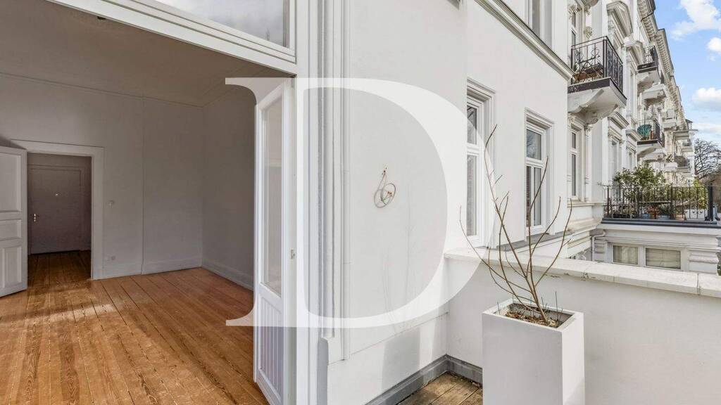 großzügige 2-Zimmer-Wohnung in der Beletage, helle Räume mit hohen Decken, ca. 3,80 m, Wohnzimmer mit Zugang zum einladenden und geräumigen Südbalkon, original Pitchpinedielen und Parkett, die Wände sind überwiegend glatt gespachtelt, viele Stilelemente wie Hamburger Fußleisten, Hohlkehlen, Stuckrosetten, Brüstungsverkleidungen, Tür- und Fensterbekleidungen, historische Kassettentüren, teilweise neu installierte Elektrik, behagliche, sonnige Wohnküche mit Parkett, Vollbad mit Marmor, Kellerraum, eine Garage kann zusätzlich für 150.000 € erworben werden