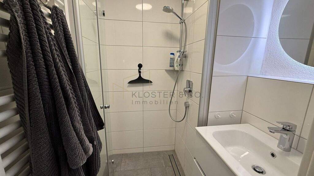 Besonders hervorzuheben ist die hochwertige Einbauküche, die bereits vollständig ausgestattet ist. Die elegante Innenausstattung - darunter Parkettboden, Fußbodenheizung und moderne Sanitärinstallationen - lässt keine Wünsche offen. Das Wohnzimmer und das Schlafzimmer sind ebenfalls vollständig eingerichtet und sofort bezugsbereit.