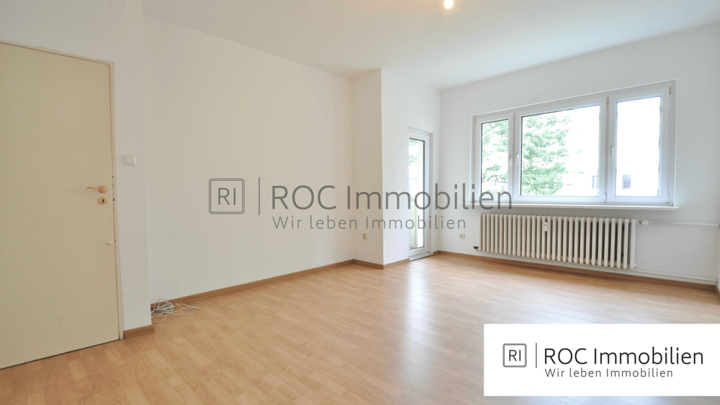 Beim Betreten der Wohnung gelangen Sie in den Flur, von dem aus alle Räume bequem erreichbar sind. Auf der linken Seite befindet sich die helle Küche mit Fenster und Blick ins Grüne. Daran anschließend öffnet sich das großzügige Wohnzimmer, das durch seine Fläche vielfältige Gestaltungsmöglichkeiten bietet. Von hier aus haben Sie Zugang zum Balkon, der zusätzlichen Wohnkomfort im Freien schafft und einen angenehmen Ausblick ins ruhige Umfeld bietet. Schräg gegenüber des Eingangs liegt das Schlafzimmer, das sich ideal als Rückzugsort nutzen lässt. Das länglich geschnittene Badezimmer ist mit einer Badewanne ausgestattet. Die Wohnung verfügt überwiegend über einen pflegeleichten Laminatboden, während Küche und Bad mit zeitlosen grauen Fliesen versehen sind.