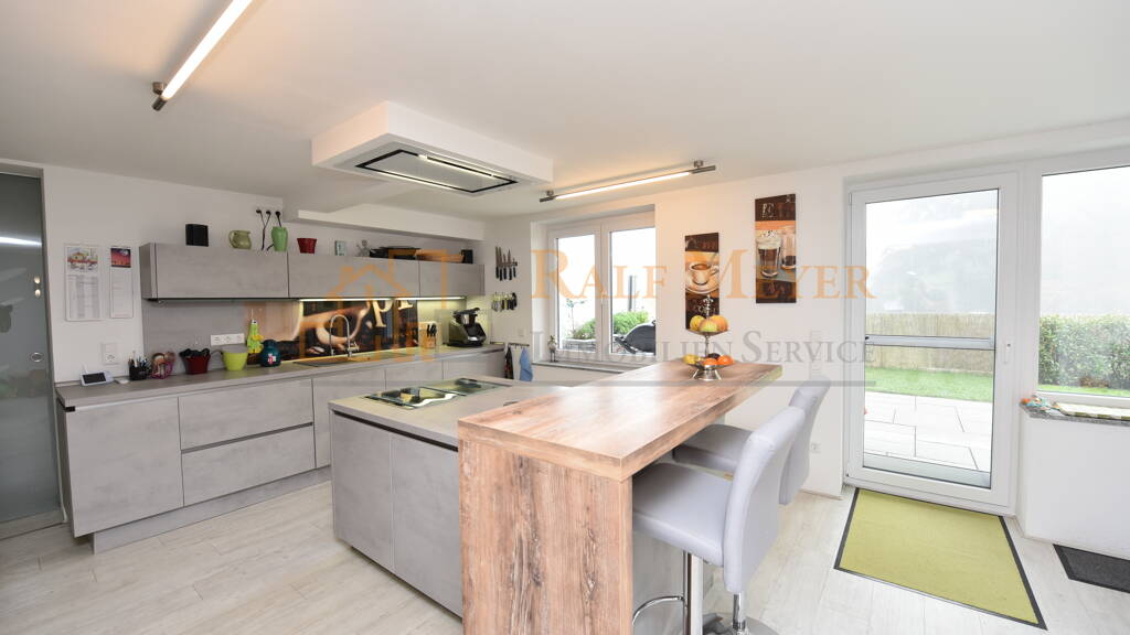 Im Erdgeschoss erwartet Sie eine Eingangsdiele mit Garderobe, eine Wohn-Küche mit äußerst komfortabler Einbauküche inkl. Kochinsel mit Sitztheke und exklusiven Einbaugeräten. Angrenzend an den offen Kochbereich befindet sich das Esszimmer mit viel Platz für Gäste oder Familie. Auch die neue Terrasse ist von hier aus zu erreichen. Des Weiteren bietet diese Ebene ein Büro, eine Abstellkammer sowie ein gemütliches Wohnzimmer in exzellenter Größe. Abgerundet wird das Erdgeschoss mit einem modernen Duschbad.