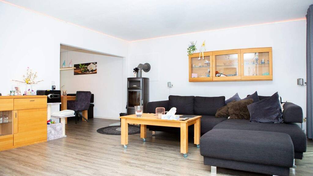 Ein praktischer Hauswirtschaftsraum mit Waschmöglichkeiten, ein modern ausgestattetes Badezimmer, der Technikraum mit effizienter Pelletheizung sowie zwei vielseitig nutzbare Zimmer bieten zahlreiche Nutzungsmöglichkeiten - ob als Homeoffice, Gästezimmer oder persönlicher Rückzugsort für Hobby und Freizeit. Über das zentrale Treppenhaus gelangen Sie in das obere Wohngeschoss, das als Herzstück des Hauses dient. Der großzügige Wohnbereich empfängt Sie mit hellen, freundlichen Räumen und einem gemütlichen Schwedenofen, der an kühlen Tagen wohlige Wärme und eine einladende Atmosphäre schafft. Direkt anschließend befindet sich die offen gestaltete Designerküche der Marke Schüller.