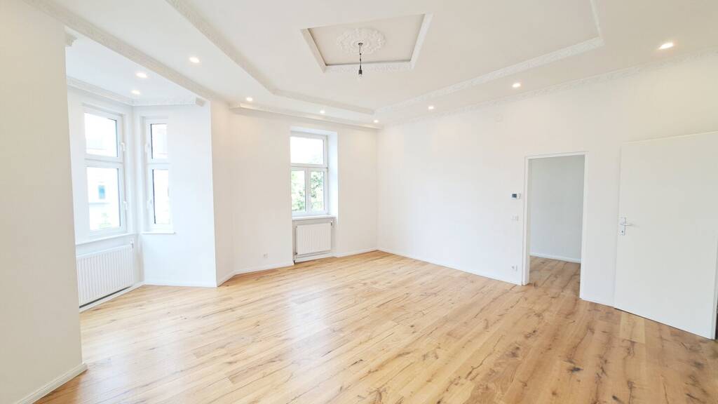 Das Herzstück der Wohnung ist zweifelsohne der beeindruckende Wohnraum mit mehreren Fenstern, einem Erker, wunderschönen Stuckdecken und integrierten Deckenspots.