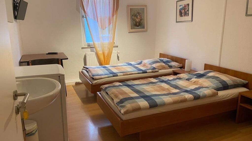 Hier bieten wir Ihnen eine kleine familäre Pension mit schwäbischer Gaststätte im Erdgeschoss und 6 Gästezimmer darüber. Die Zimmer haben alle Einzelbetten. Jedes Zimmer hat TV und Kühlschrank. Die Zimmer sind auf 2 Stockwerke verteilt, je 3 Stück. Auf jedem Stockwerk gibt es eine Dusche mit WC und ein extra WC, sodass genügend Sanitärräume vorhanden sind für alle Gäste. Im. 2. Stockwerk gibt es eine grosse Gästeküche, um sich selber verpflegen zu können.