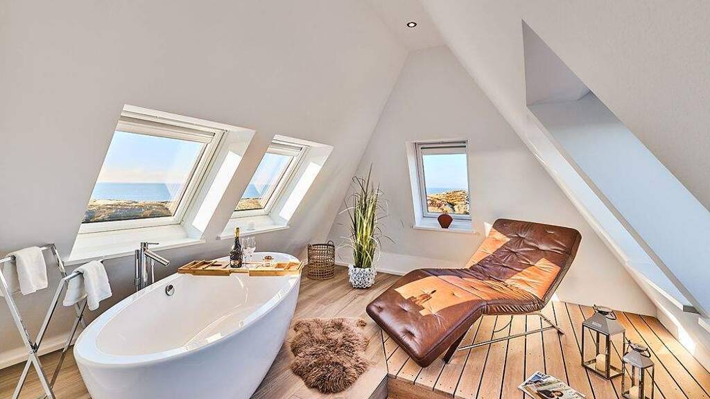 Über eine Treppe erreichen Sie bequem den ausgebauten Spitzboden. Absolutes Highlight: der Raum zur individuellen Nutzung ist offen gestaltet mit einer auf einem Podest freistehenden Badewanne und Blick auf die Nordsee! Wir sind uns sicher: Sie werden diesen architektonisch außergewöhnlichen Logenplatz lieben. Ein separates WC auf dieser Ebene erfüllen die Ansprüche komplett.