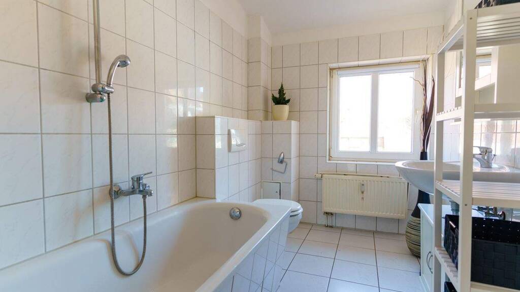 Auf ein Wohnzimmer, Küche, Tageslicht-Vollbad und Wohnungsflur in der ersten Wohnebene und zwei weitere Zimmer in der zweiten Wohnebene verteilt sich die Gesamtwohnfläche von ca. 59 qm. Die gesamte Wohnung ist hell und freundlich, von der Küche, dem Bad und dem hinteren Zimmer der zweiten Wohnebene haben Sie einen herrlichen Weitblick auf die Georgenkirche und den Marienkirchturm.