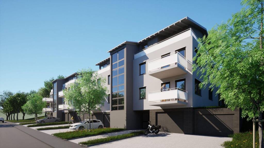 Zwei Mehrfamilienhäuser, die harmonisch in die umgebende Landschaft eingebettet werden, beinhalten jeweils 4 Eigentumswohnungen und eine Penthausetage mit einem bzw. zwei kleinen Penthäusern.