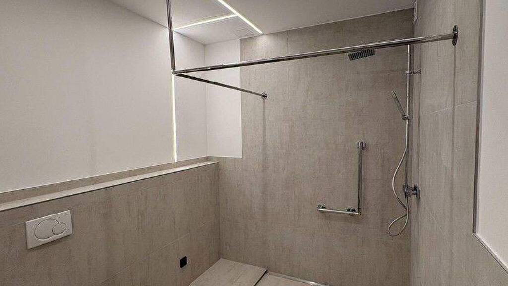 Das Badezimmer ist vollständig rollstuhlgerecht ausgeführt mit bodengleicher Dusche und unterfahrbarem Waschtisch.