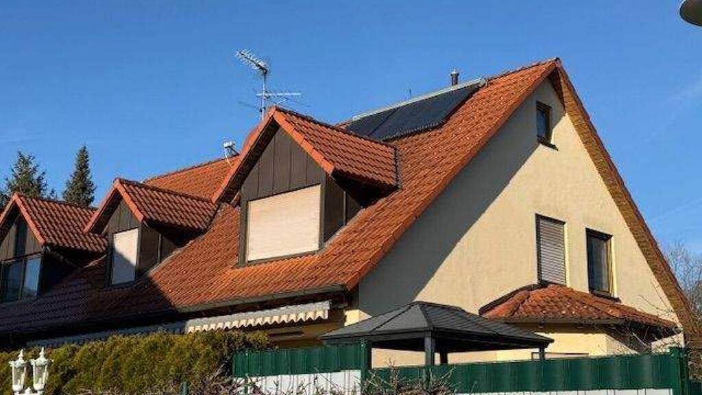 Das Dach (Satteldach) ist in mit Frankfurter Pfanne gedeckt und in