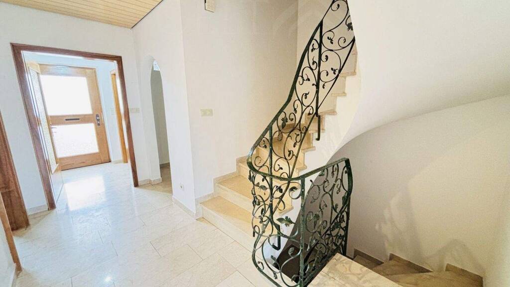 Ein besonderes architektonisches Highlight bildet die geschwungene Wendeltreppe mit verziertem Geländer, die beide Wohnetagen elegant miteinander verbindet. Große Fenster sorgen in allen Räumen für viel Tageslicht und ein freundliches Wohnambiente, während integrierte Jalousien zusätzlichen Komfort und Sichtschutz bieten.