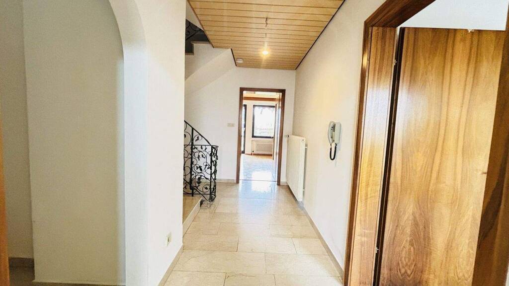 Der Eingangsbereich beeindruckt mit edlen Marmorfliesen, während in den Wohnräumen ein hochwertiger Parkettboden für eine warme und angenehme Atmosphäre sorgt. Stilvolle Holzdecken verleihen den Räumen zusätzlichen Charakter und unterstreichen den wohnlichen Charme des Hauses.