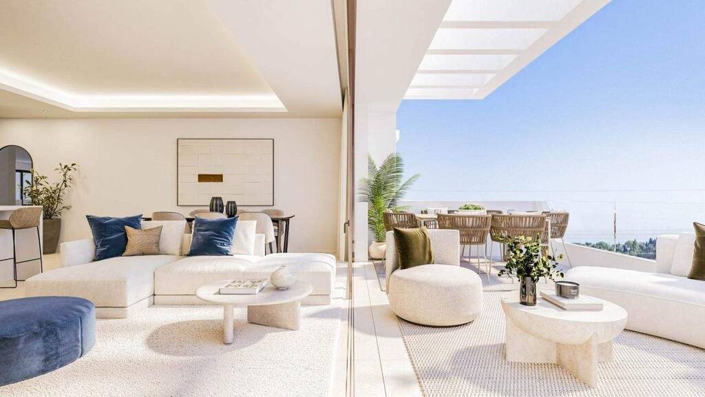 Dieses zeitgenössische Penthouse mit 2 Schlafzimmern und 2 Bädern befindet sich auf der obersten Etage einer modernen Wohnanlage in Mijas Costa. Es bietet großzügige Außenflächen, viel natürliches Licht und eine privilegierte Lage umgeben von Natur und Golflandschaften. Die Entwicklung liegt in einer ruhigen Enklave mit ausgezeichneten Anbindungen nach Mijas, Fuengirola und Málaga, wie im Projektüberblick beschrieben. Das Interieur ist um einen offenen Grundriss herum gestaltet, der Wohnzimmer, Essbereich und Küche in einen eleganten, zusammenhängenden Raum integriert. Große Glasflächen von Boden zu Decke sorgen tagsüber für Helligkeit und ermöglichen direkten Zugang zur umfangreichen Terrasse des Penthouses. Die Terrasse erstreckt sich über die ganze Breite der Residenz und windet sich teilweise um die Einheit, wodurch mehrere Außenbereiche entstehen - ideal zum Entspannen, Speisen oder Unterhalten. Dieser großzügige Außenbereich ist eines der markanten Merkmale der Immobilie und bietet eine echte Erweiterung des Innenwohnraums. Die Küche ist vollständig mit zeitgemäßen Einbaukästen, Quarz-Arbeitsplatten und Bosch-Geräten ausgestattet, einschließlich Induktionskochfeld, Ofen und Dunstabzugshaube, wie im Bauunterlagen festgelegt. Das Hauptschlafzimmer verfügt über Einbauschränke, ein en-suite Badezimmer mit Porcelanosa-Fliesen und Premium-Armaturen von Laufen und Hansgrohe sowie direktem Zugang zur Terrasse. Das zweite Schlafzimmer ist gut proportioniert und liegt neben dem zweiten Vollbad, das die gleichen eleganten Oberflächen aufweist. Im gesamten Penthouse sorgt hochwertiges Kömmerling PVC-Außenholzwerk mit Doppelverglasung für hervorragenden Wärme- und Schalldämmkomfort. Eine zentrale Klimaanlage mit intelligentem Airzone-ähnlichen Steuersystem bietet effiziente Heizung und Kühlung, während Warmwasser durch ein zentrales Aerothermie-System bereitgestellt wird. Ein mechanisches Belüftungssystem sorgt für ständigen Luftaustausch und eine gesündere Innenumgebung. Bewohner der Anlage genießen Zugriff auf ein umfassendes Angebot gemeinschaftlicher Annehmlichkeiten, darunter ein zentraler Swimmingpool, angelegte Gärten, Fitnessraum, Saunen, Gemeinschaftsraum und Relaxzonen. Tiefgarage, Vorinstallation für Ladestationen für Elektrofahrzeuge und verbesserten Zugangskontrollen tragen zusätzlich zu täglichem Komfort und Sicherheit bei. Die Lage nahe der Küste, Golfplätzen, Einzelhandel und wichtigen Verkehrsanbindungen bietet einen verfeinerten Lebensstil mit einer außergewöhnlichen Balance aus Privatsphäre, modernem Design und Bequemlichkeit. Für weitere Informationen oder um einen Besichtigungstermin zu vereinbaren.