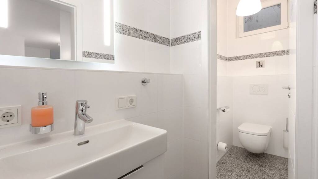 Das Obergeschoss punktet mit einem exklusiven Chefbüro von fast 30 m², edlem Mobiliar und direktem Zugang zum sonnigen Balkon mit XXL-Markise. Zwei weitere Büros sowie ein hochwertiges Badezimmer mit bodengleicher Dusche, Bidet und großem Spiegelschrank komplettieren diese Etage.