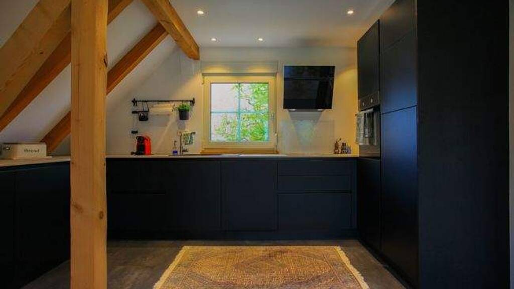 Über eine schöne Holztreppe gelangen Sie in den großzügigen Wohn- und Essbereich im Obergeschoss. Die offene, moderne Küche ist mit hochwertigen Geräten ausgestattet und lädt zum gemeinsamen Kochen ein. Der angrenzende Wohnbereich mit bodentiefen Fenstern sorgt für viel Licht und bietet einen herrlichen Blick ins Grüne. Die sichtbaren Holzbalken und der stilvolle Parkettboden verleihen dem Raum eine besonders gemütliche Atmosphäre.