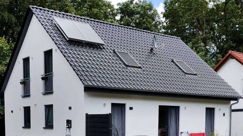 Sämtliche Fenster sind 3-Fach-verglast in Kunststoffrahmen und mit Plissees ausgestattet. Warmwasser wird über Solarthermie aufbereitet. Es gehört ein KFZ-Stellplatz am Haus mit Ladesäule für ein E-Auto zur Wohnung dazu.